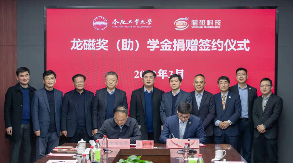 3月3日、龍磁科技と合肥工業(yè)大學は、特別學習支援協(xié)定を締結(jié)し、「龍磁奨(助)學金」を設(shè)立し、式典が合肥工業(yè)大學で盛大に行われた。合肥工業(yè)大學黨委員會書記の余其俊、黨委員會常務(wù)委員?副校長(正庁級)の呉玉程、校長補佐?大學院常務(wù)副院長の劉心報、本科學生院、科學研究院、同窓會、材料科學?工程學院、電気?自動化工程學院、建築?蕓術(shù)學院などの大學院の上役が調(diào)印式に出席した。